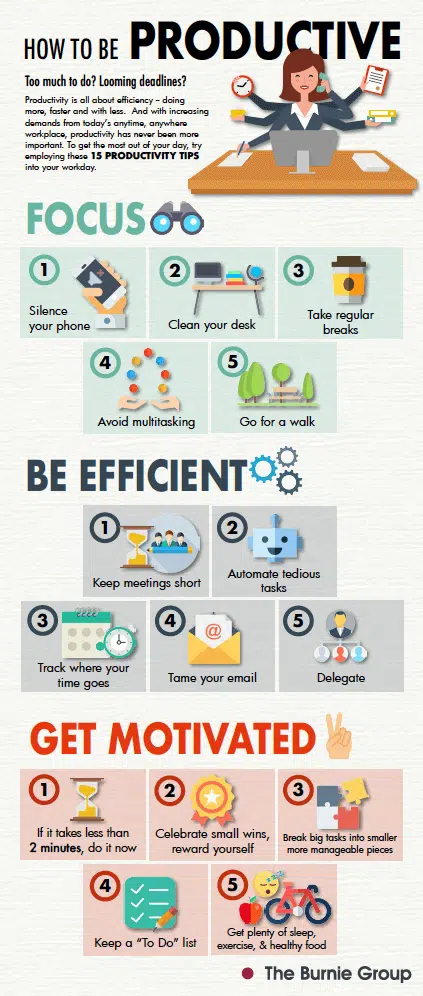 Productivity is all about efficiency — doing more, faster and with less. And with increasing demands from today’s anytime, anywhere workplace, productivity has never been more important. To get the most out of your day, try employing these 15 PRODUCTIVITY TIPS into your workday.